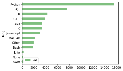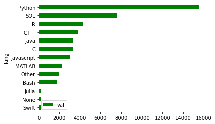 df.plot.barh(x='lang', y='val', color='g')