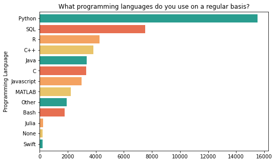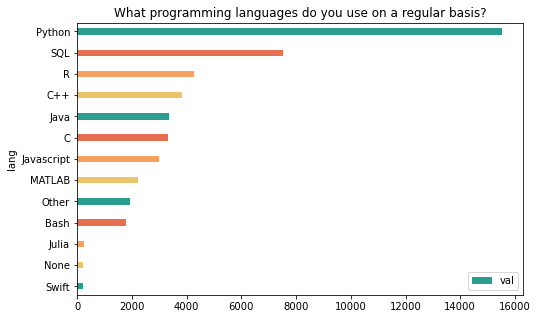 df.plot.barh(x='lang', y='val', figsize=(8,5), xlabel="Programming Language", title="What programming languages do you use on a regular basis?", width=0.8, color=['#2a9d8f', '#e9c46a', '#f4a261', '#e76f51'], legend=False)