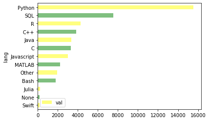 df.plot.barh(x='lang', y='val', color=['yellow', 'green'], alpha=0.5) #두 가지 색을 넣어 반복
