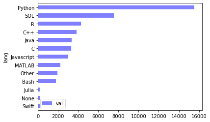 df.plot.barh(x='lang', y='val', color='b', alpha=0.5)