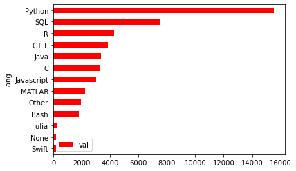 df.plot.barh(x='lang', y='val', color='r')
