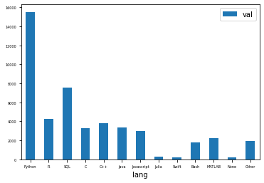 df.plot.bar(x="lang", y="val", rot=0, fontsize=5)