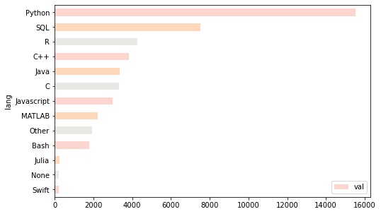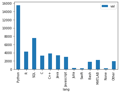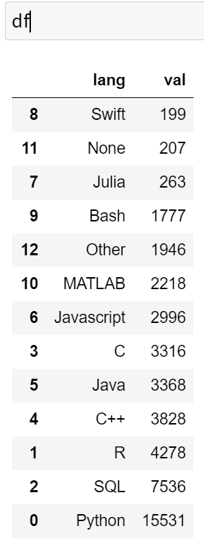 df = pd.DataFrame({'lang':['Python', 'R', 'SQL', 'C', 'C++', 'Java', 'Javascript', 'Julia', 'Swift', 'Bash', "MATLAB", 'None', 'Other'], 'val':[15531, 4278, 7536, 3316, 3828, 3368, 2996, 263, 199, 1777, 2218, 207, 1946]})