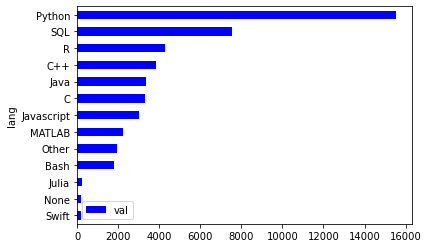 df.plot.barh(x='lang', y='val', color='b', alpha=0.5)