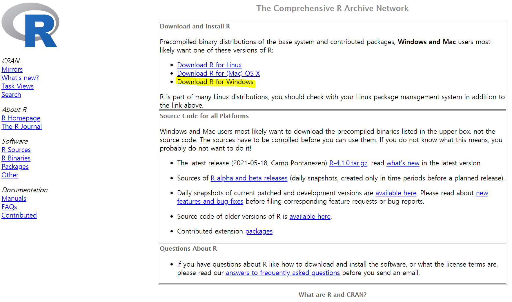 1. R 공식 웹사이트에 들어간다 https://cran.r-project.org/