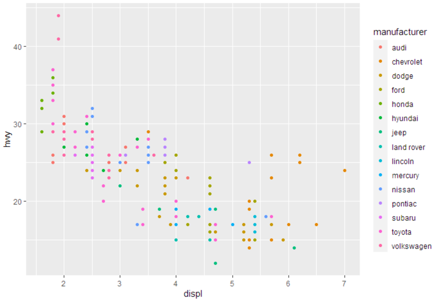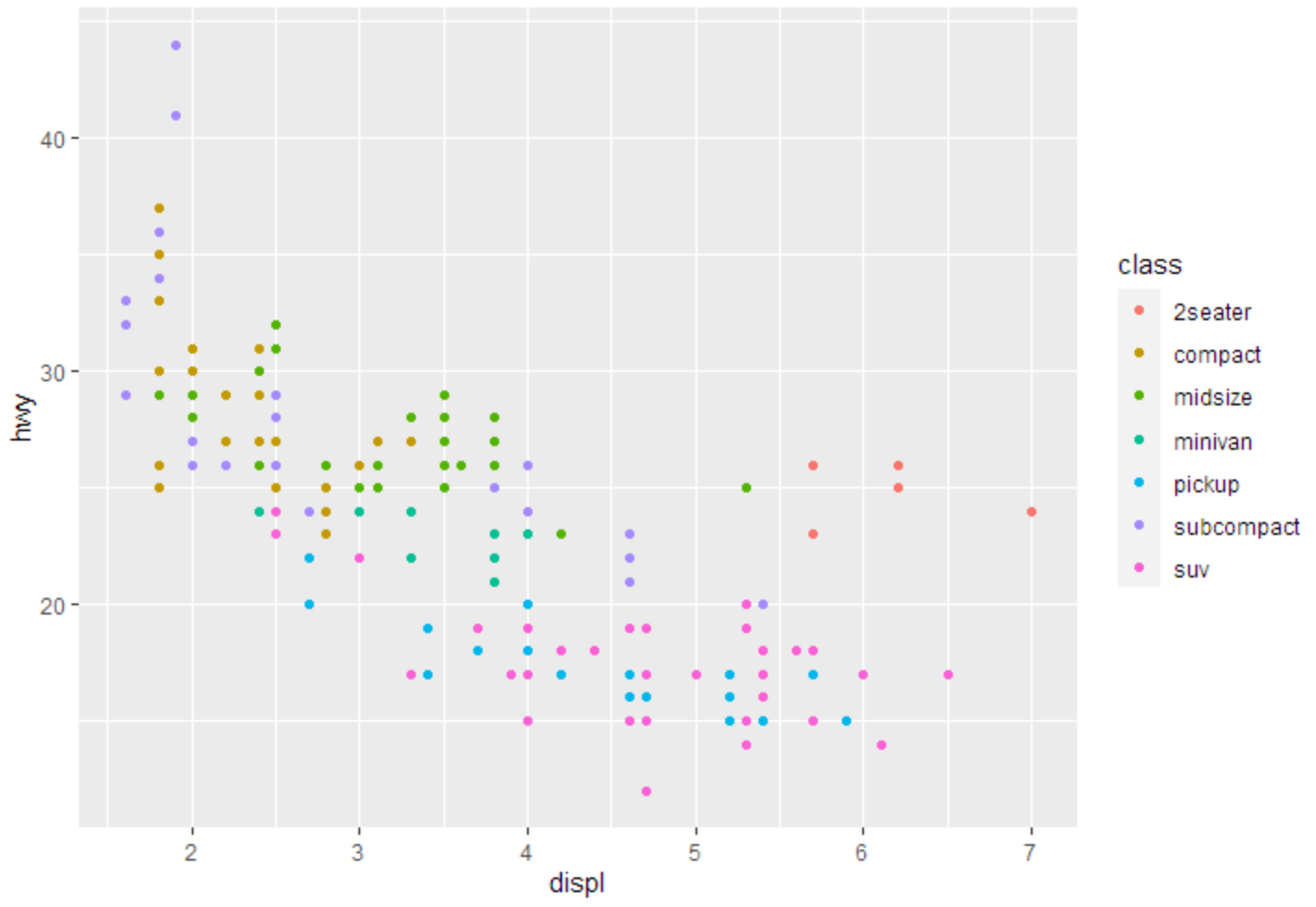 ggplot(data=mpg)+geom_point(mapping=aes(x=displ, y=hwy, color=class))