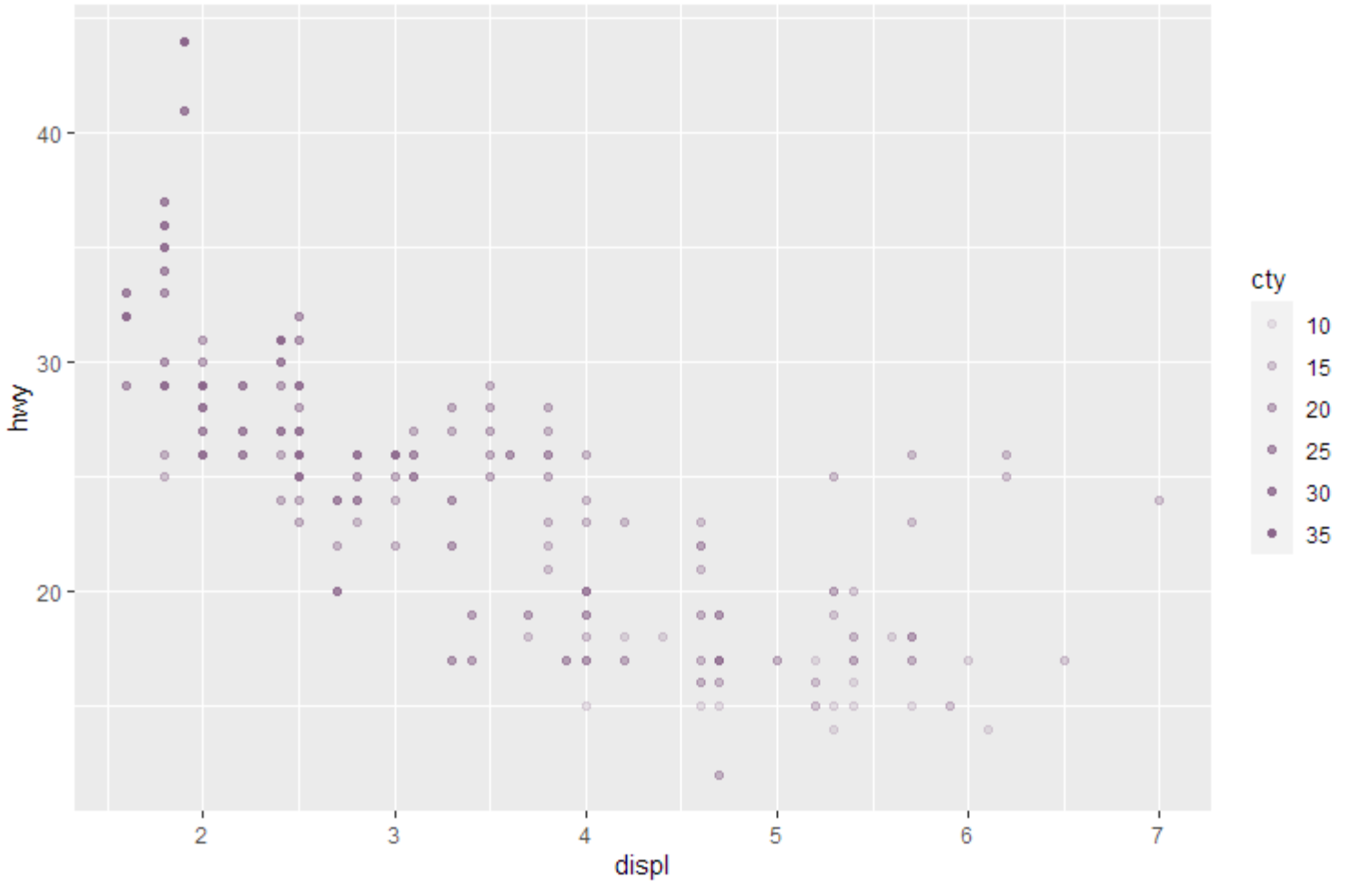 ggplot(data=mpg)+geom_point(mapping=aes(x=displ, y=hwy, alpha=cty), color="plum4")