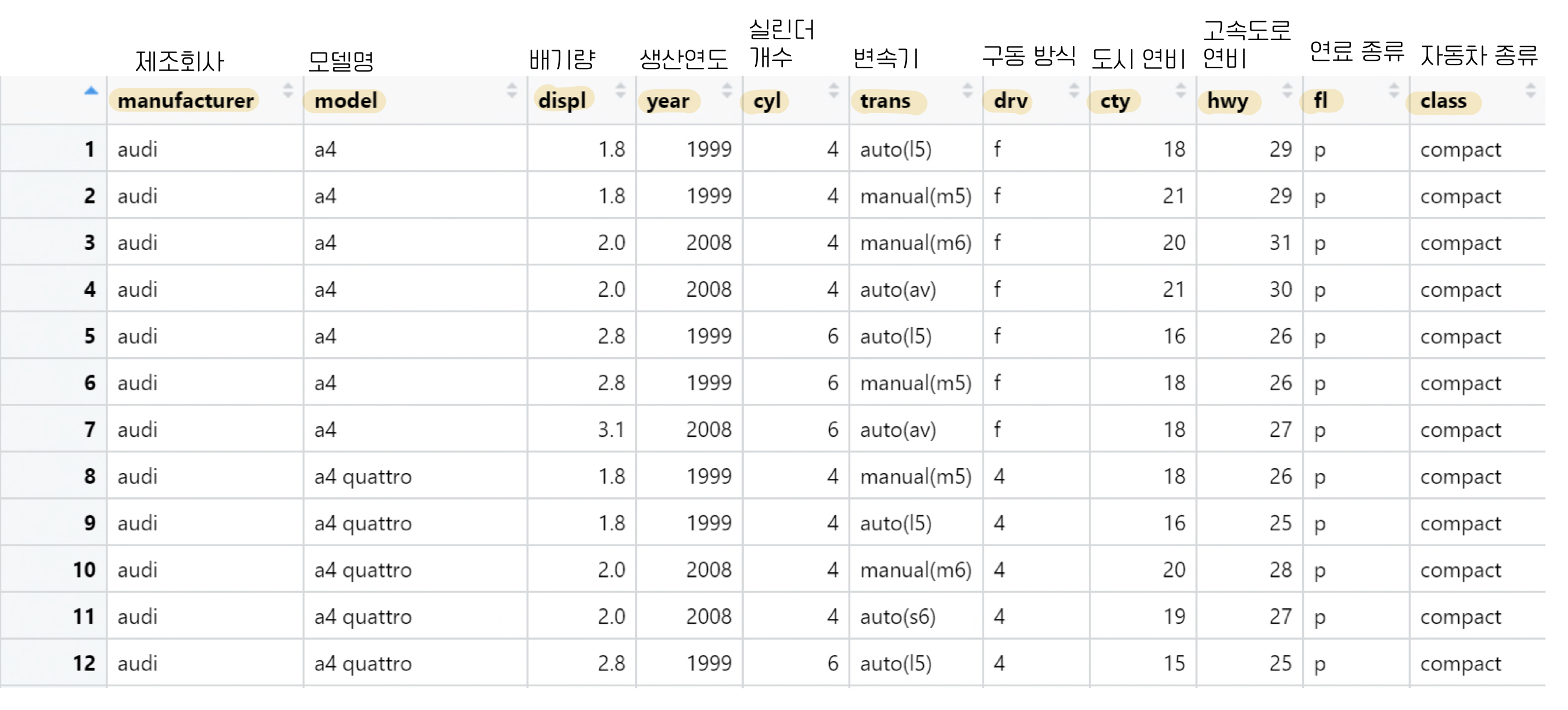 이 글에서는 ggplot2 패키지에 포함되어 있는 데이터셋인 mpg를 사용해서 산포도 (scatter plot)을 그려보도록 하겠습니다.