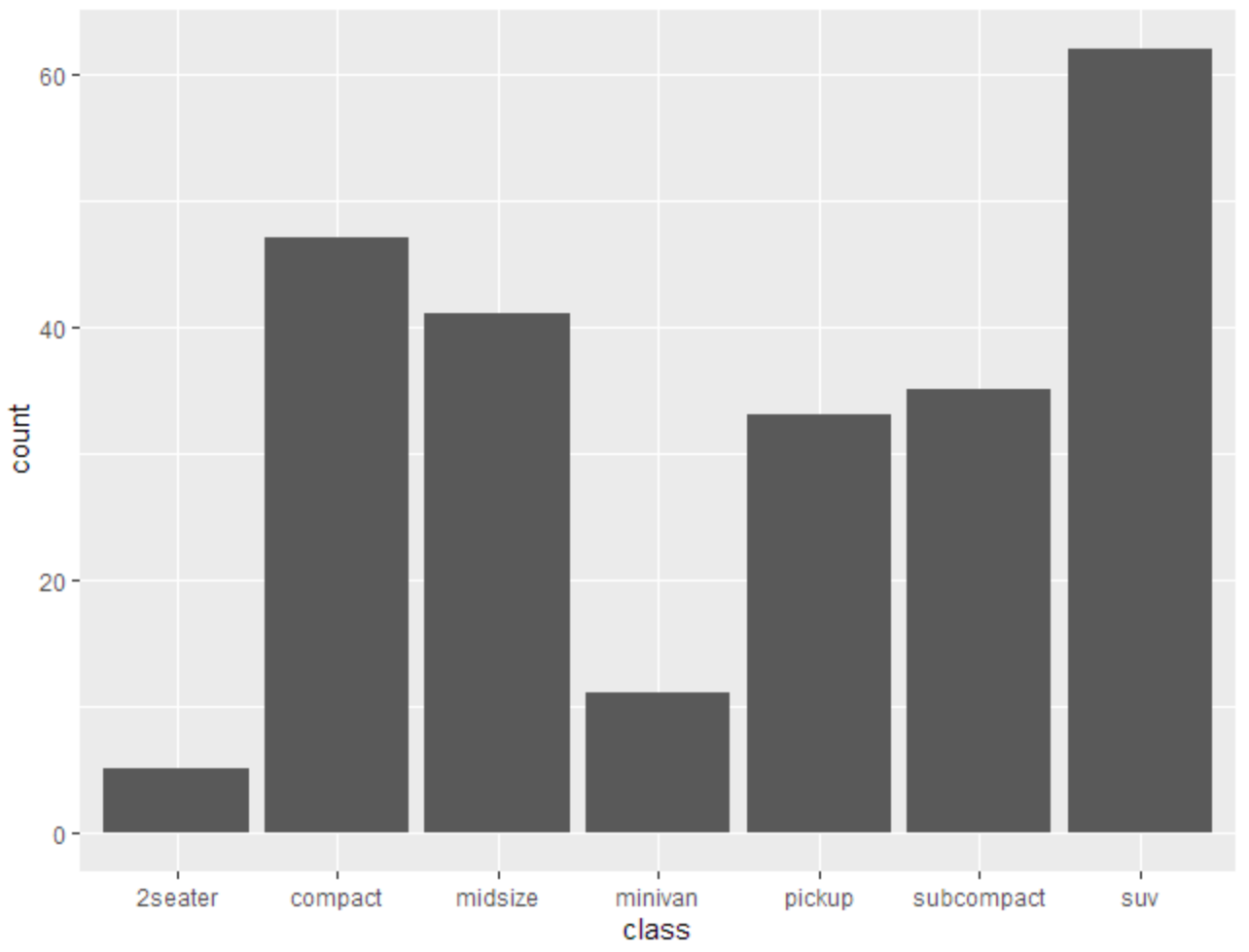 ggplot() + geom_bar(mpg, aes(class)) ggplot(mpg) + geom_bar(aes(class)) ggplot(mpg, aes(class)) + geom_bar()