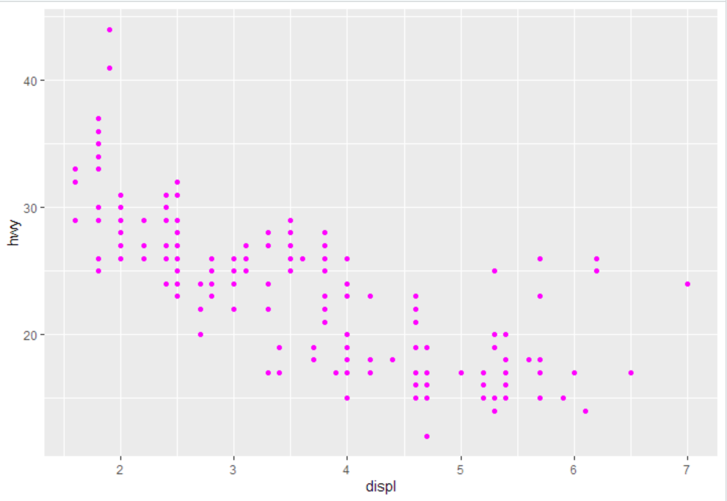 ggplot(data=mpg)+geom_point(mapping=aes(x=displ, y=hwy), color="magenta")