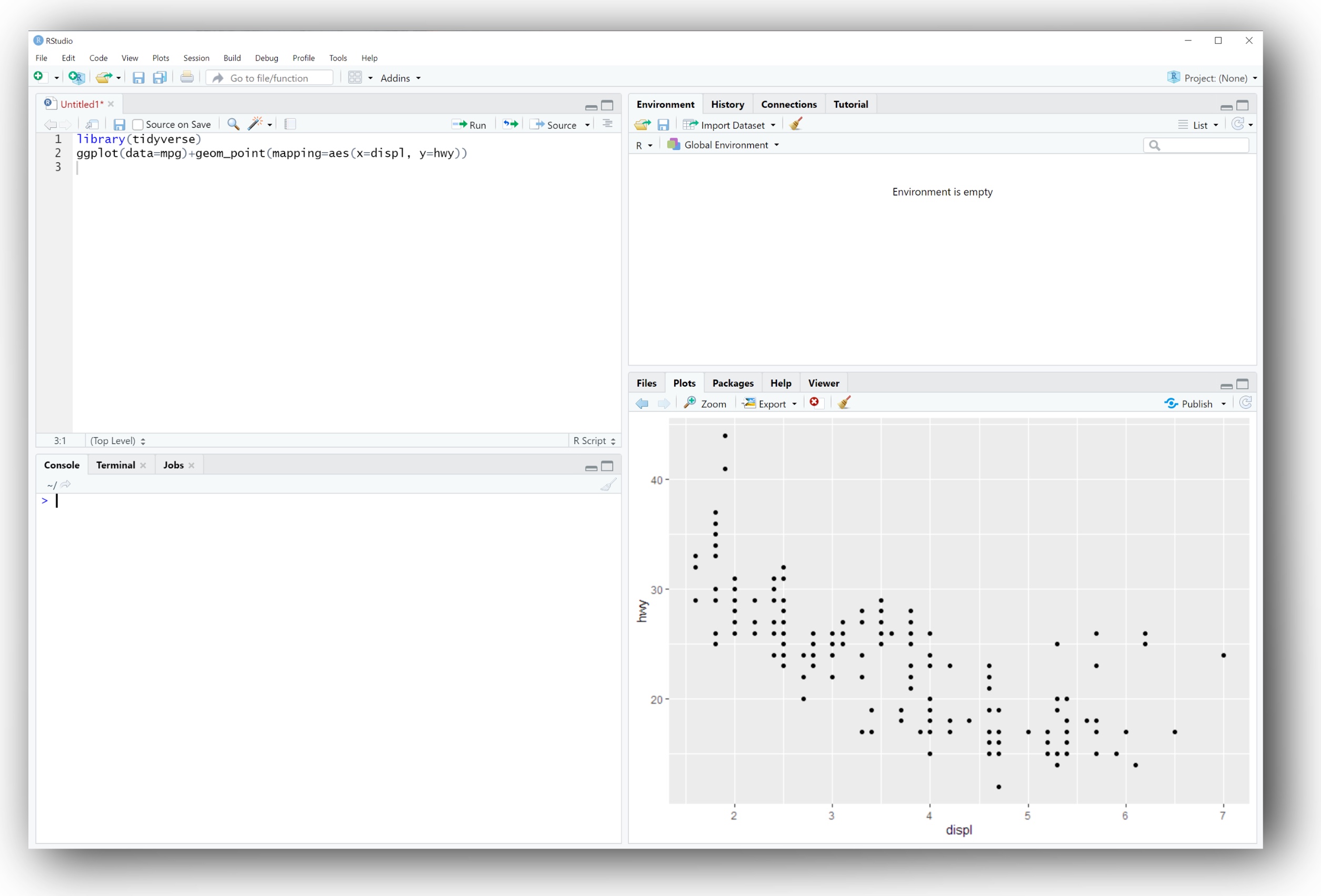ggplot(data=mpg)+geom_point(mapping=aes(x=displ, y=hwy)) ggplot(mpg)+geom_point(aes(displ, hwy)) # data=, mapping= 생략 가능