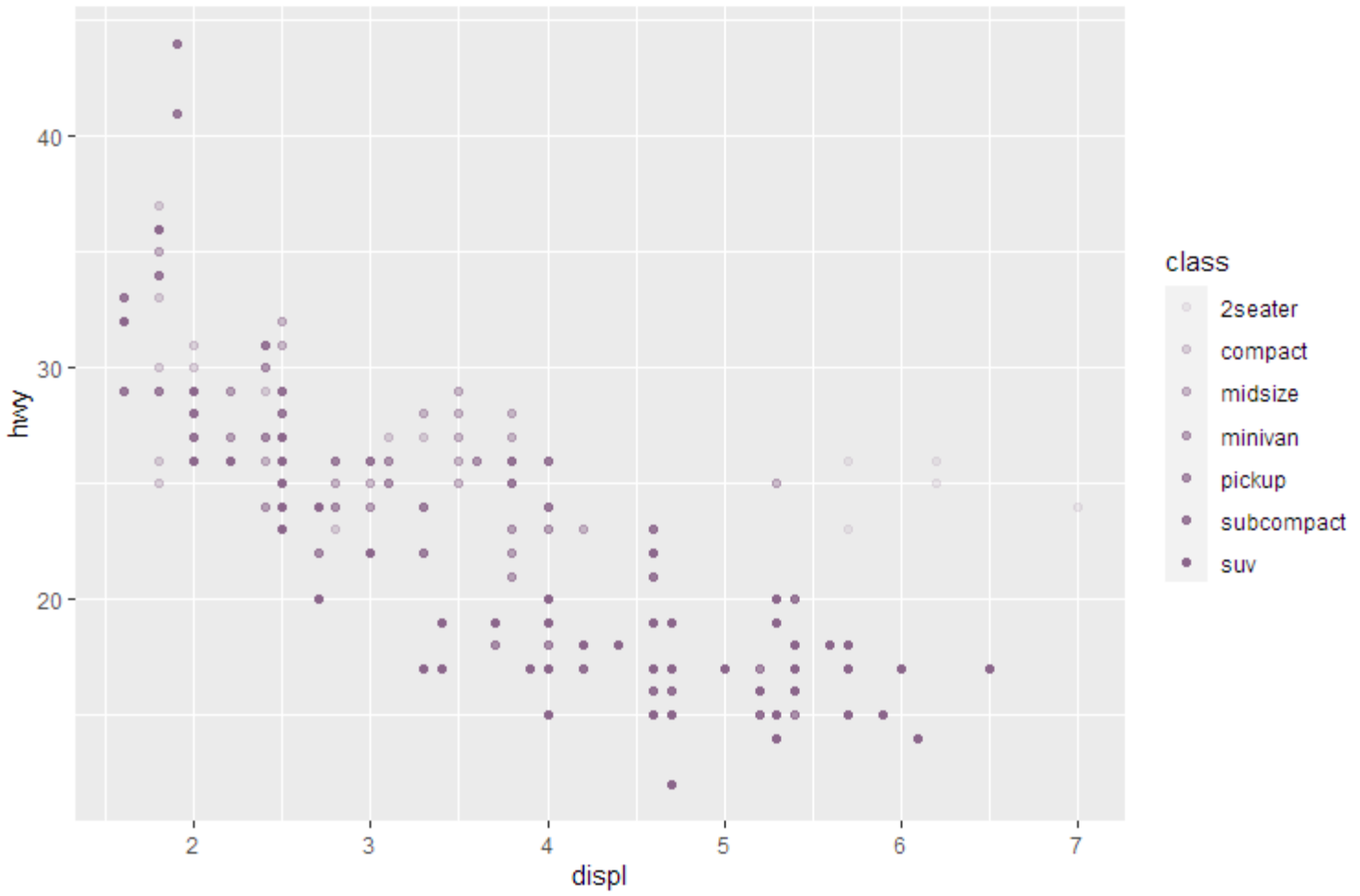 ggplot(data=mpg)+geom_point(mapping=aes(x=displ, y=hwy, alpha=class), color="plum4")