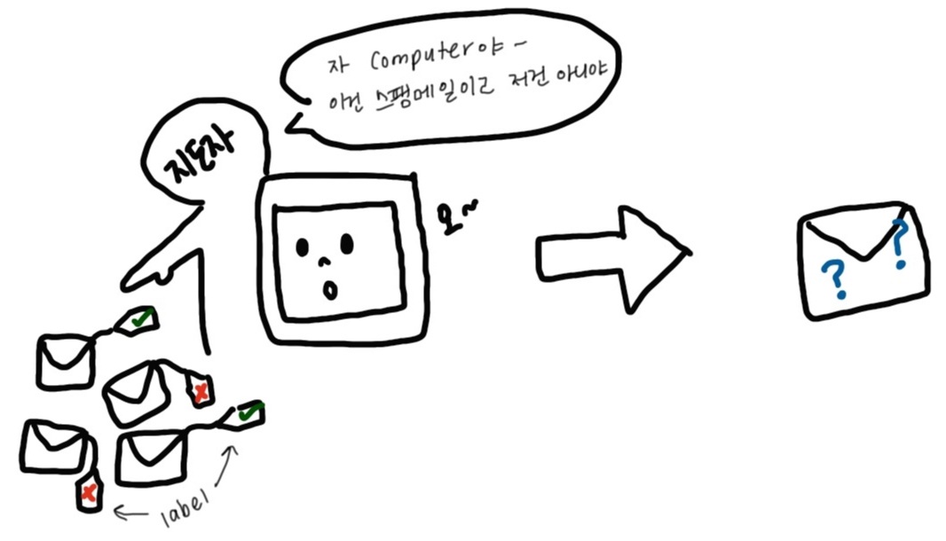 예를 들면 스팸 메일을 분류시키고 싶을 때 컴퓨터에게 다양한 메일을 보여주면서 배우게 하는데 이때 어떤 이메일이 스팸인지 '상표 label'이 달려있는 메일을 보여주는 거다. 이걸 토대로 컴퓨터가 배워서 새로 이메일이 들어왔을 때 그게 스팸인지 아닌지 분류를 하는 게 지도 학습이다.