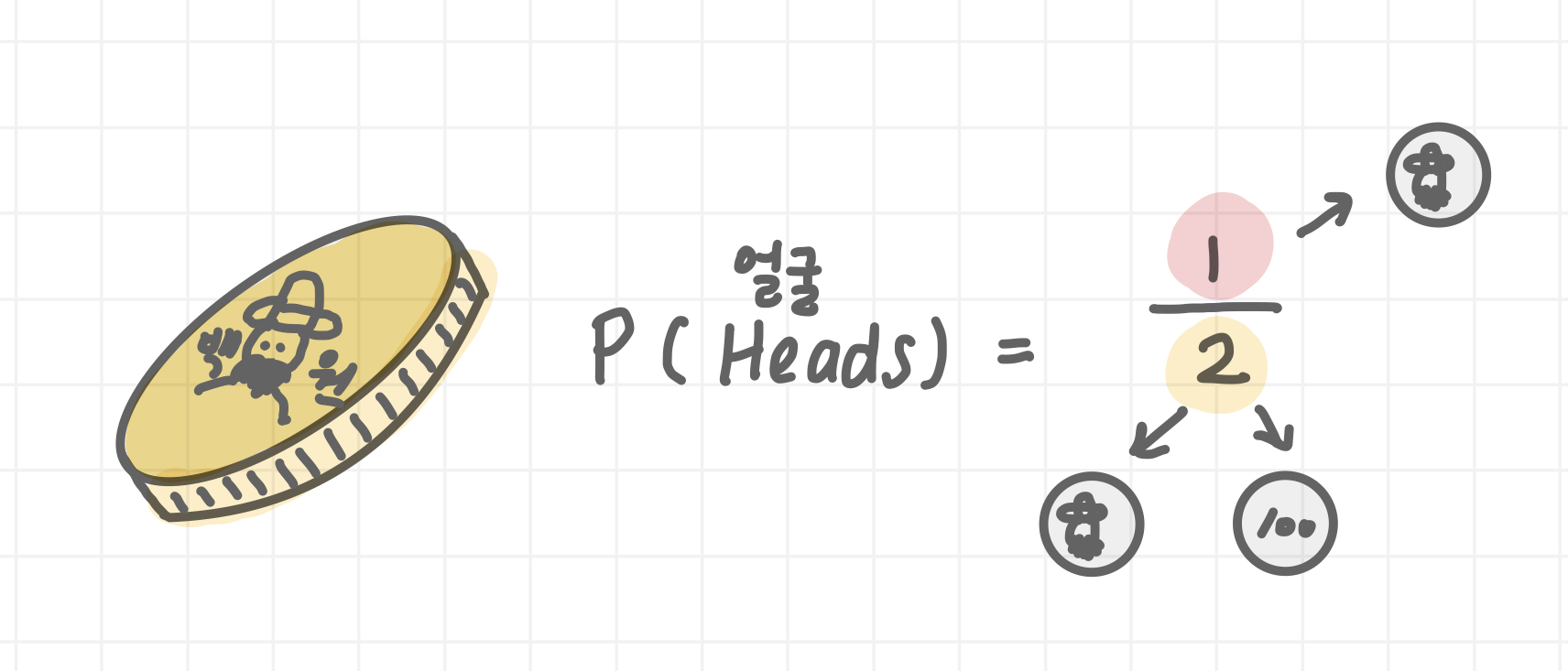예를 들어, 동전을 던졌을 때 얼굴이 나오는 확률은 나올 수 있는 경우 숫자면, 얼굴면 2가지 경우에서 하나이기 때문에 1/2 = 0.5 = 50%의 확률입니다.