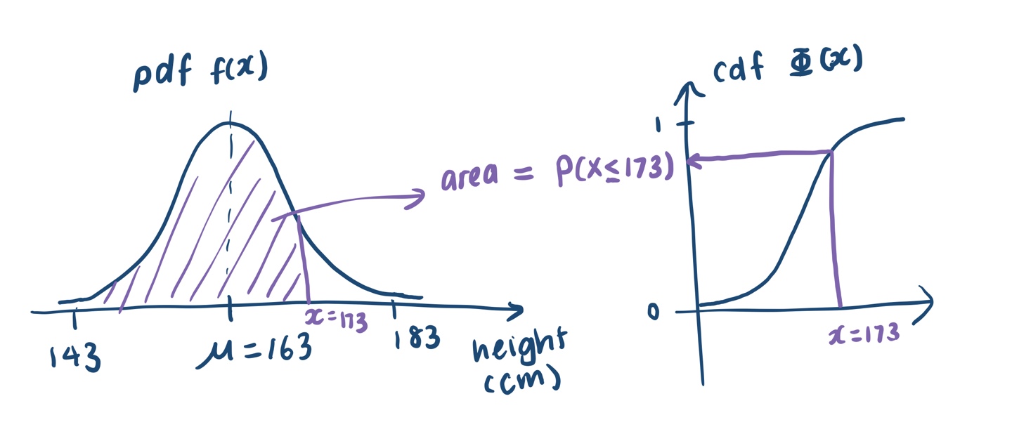 예) 정규분포의 확률분포 함수 pdf (왼쪽)와 누적 분포 함수 cdf (오른쪽)