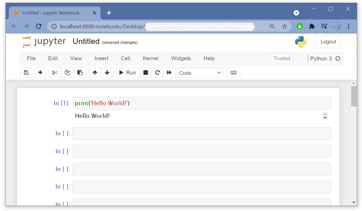 밑에는 새로운 노트북에 Hello World를 출력한 모습입니다.
