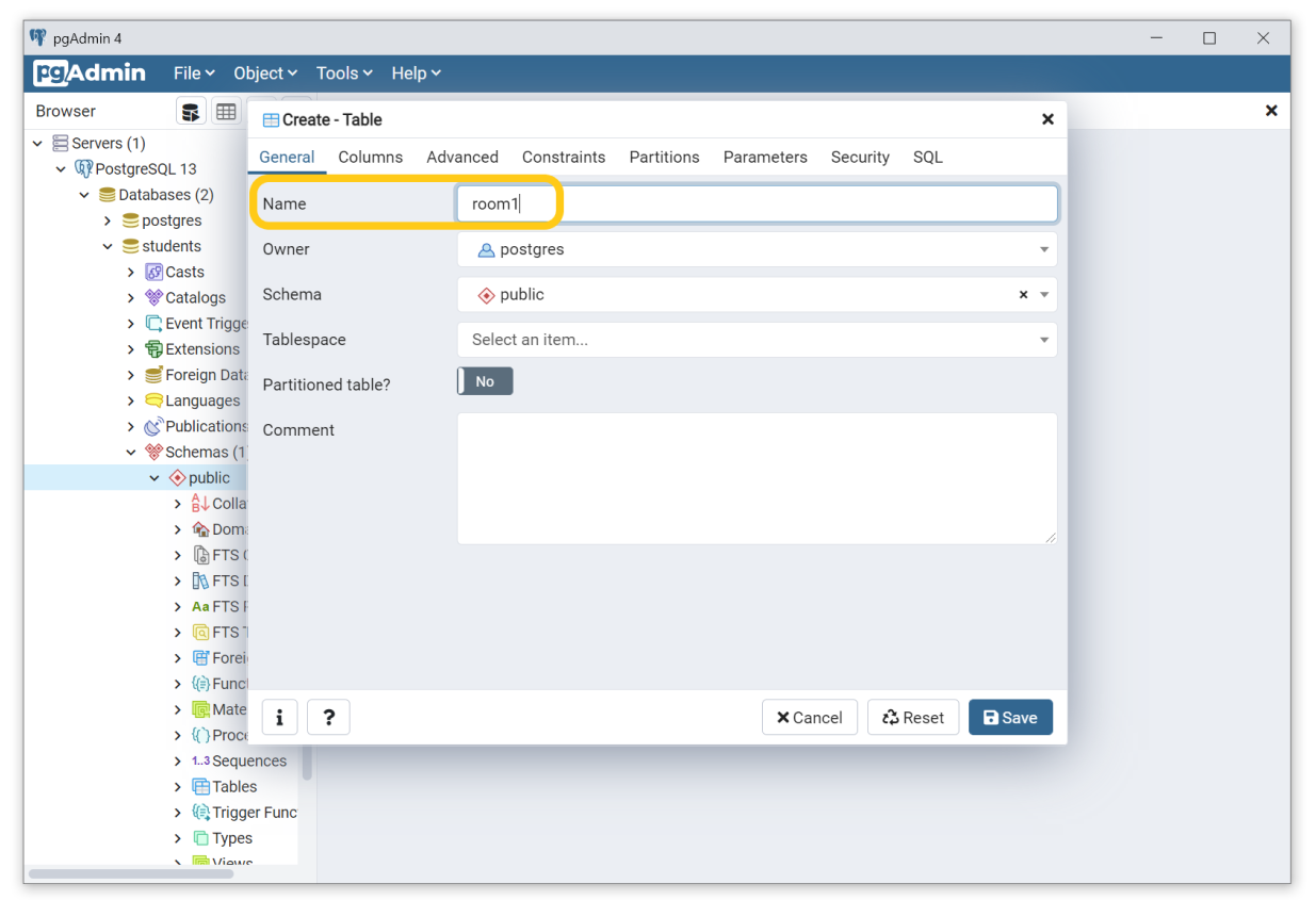 테이블을 생성하고 싶은 데이터베이스를 선택한 후 밑 메뉴에서 Public > Create > Table...를 클릭해주세요