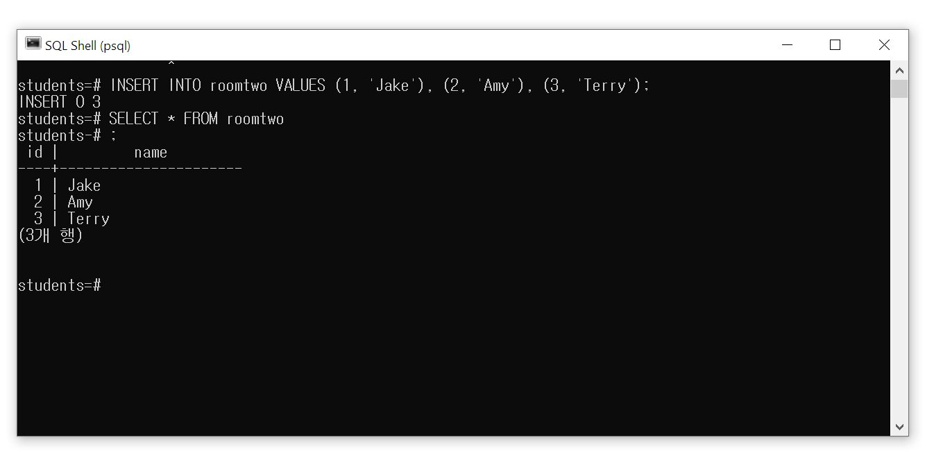 위 문법을 사용하여 roomtwo 테이블에 학생들 관련 데이터를 입력해 주었습니다.