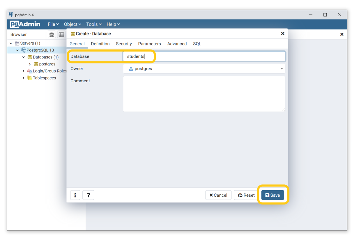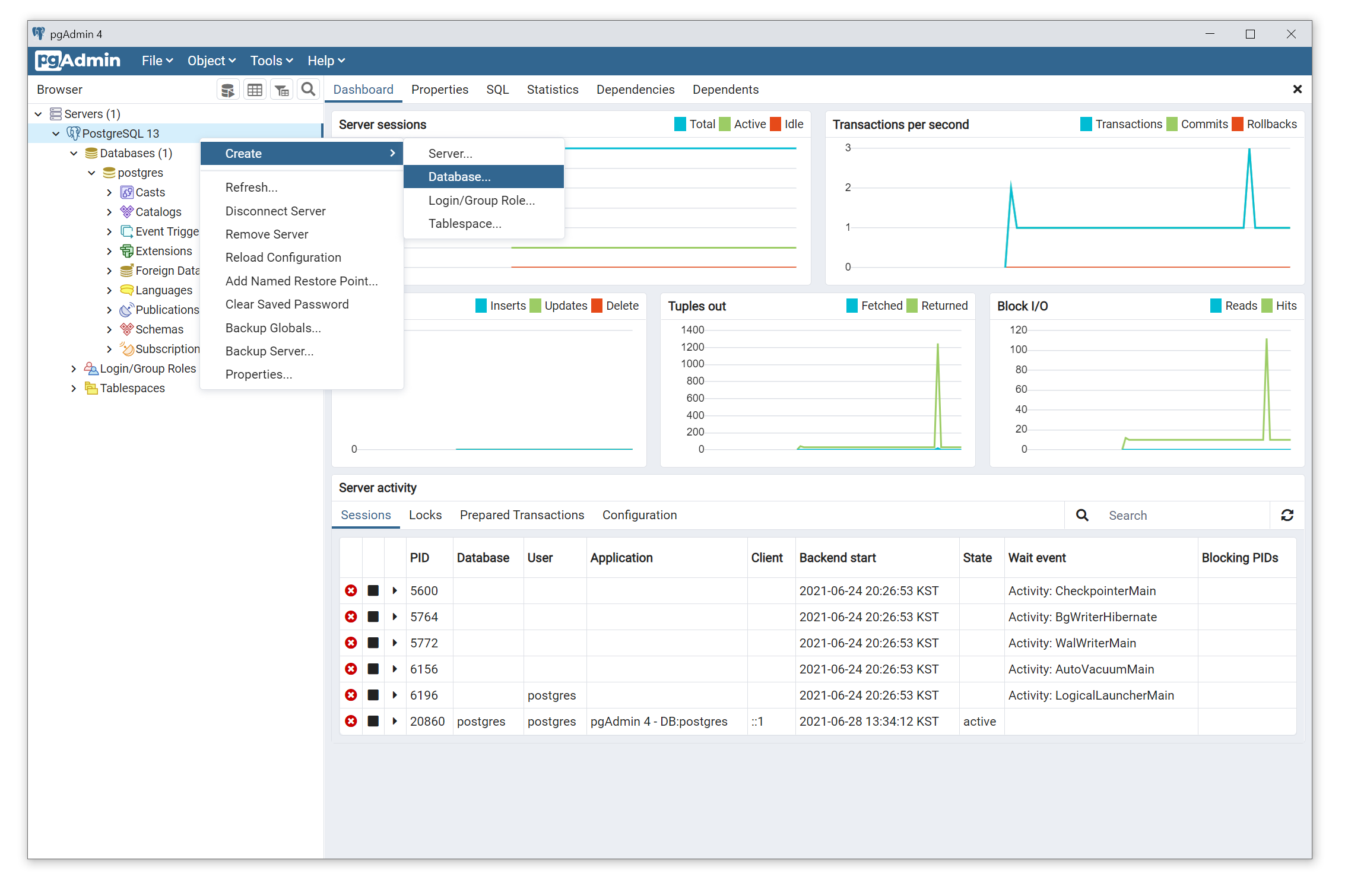 'PostgreSQL 13' 오른쪽 클릭 > Create > Database... 클릭