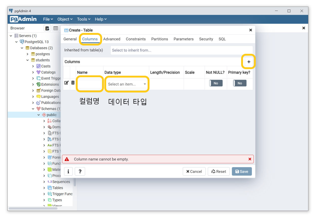 +를 누르면 컬럼을 추가할 수 있습니다.