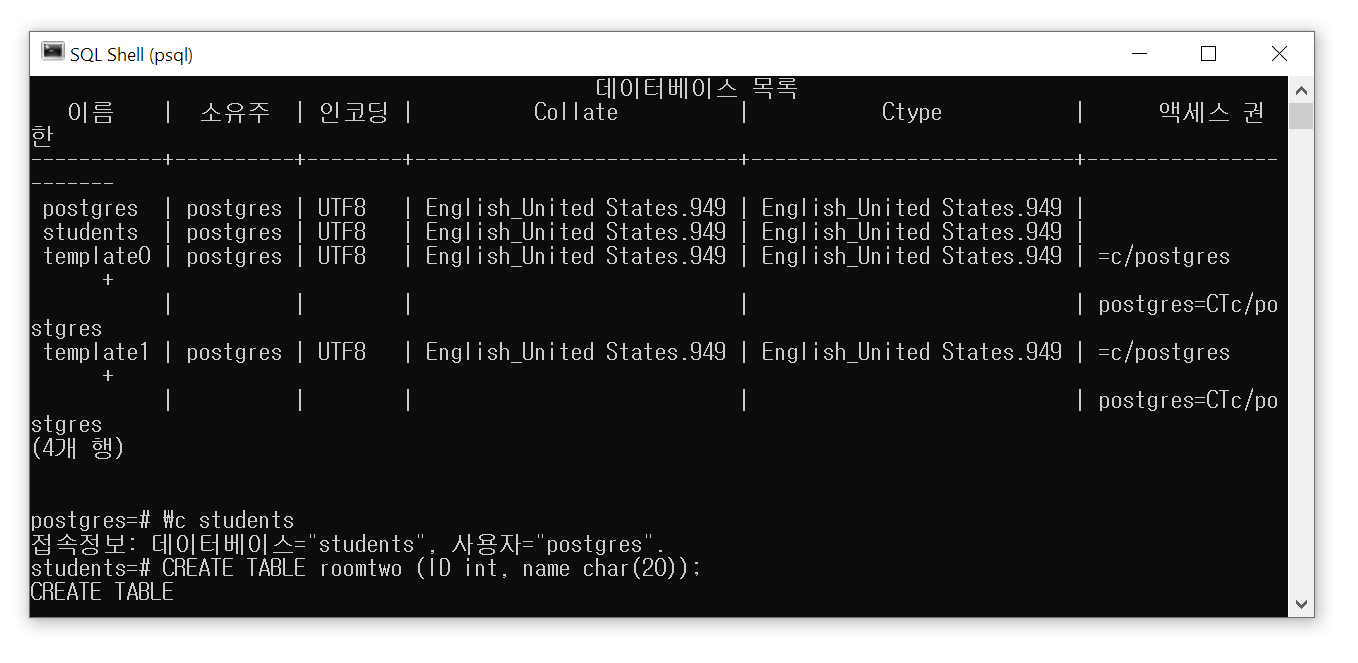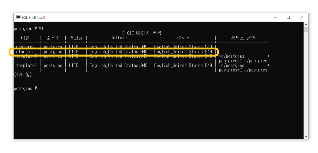 SQL 쉘에서 students 데이터베이스를 만들어 보겠습니다.