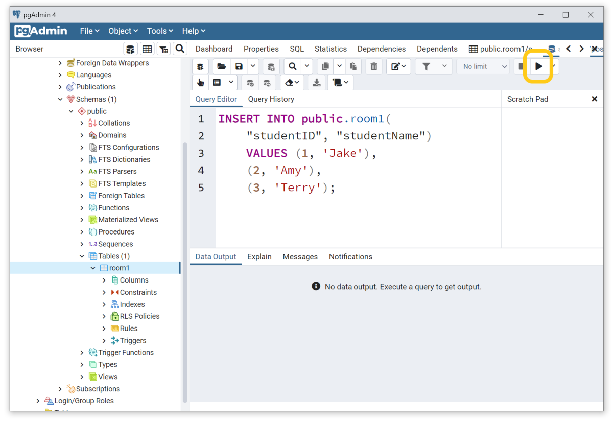 "Query returned succesfully in __ msec."이 뜬다면 정상적으로 입력이 된 걸 확인할 수 있습니다.