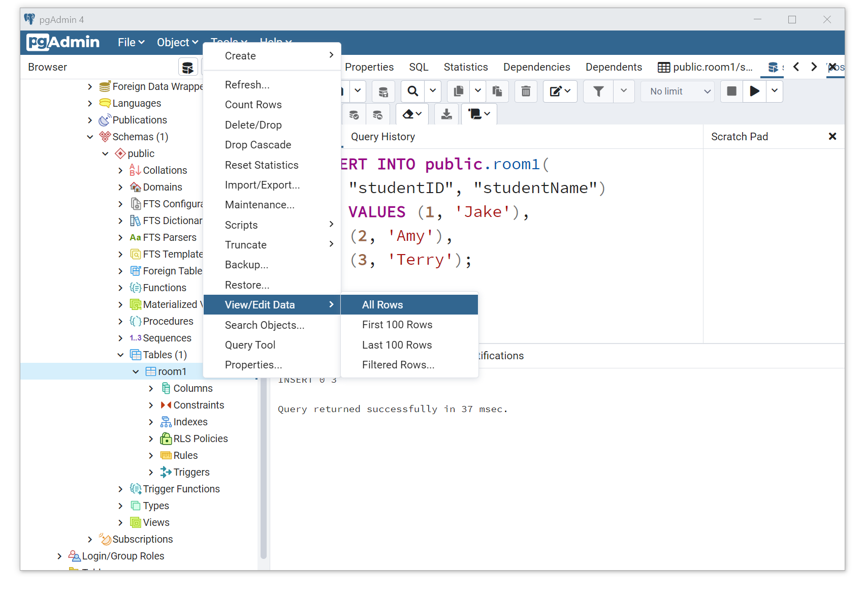 테이블 값을 확인하고 싶다면 테이블 오른쪽 클릭 > View/Edit Data > All Rows 클릭