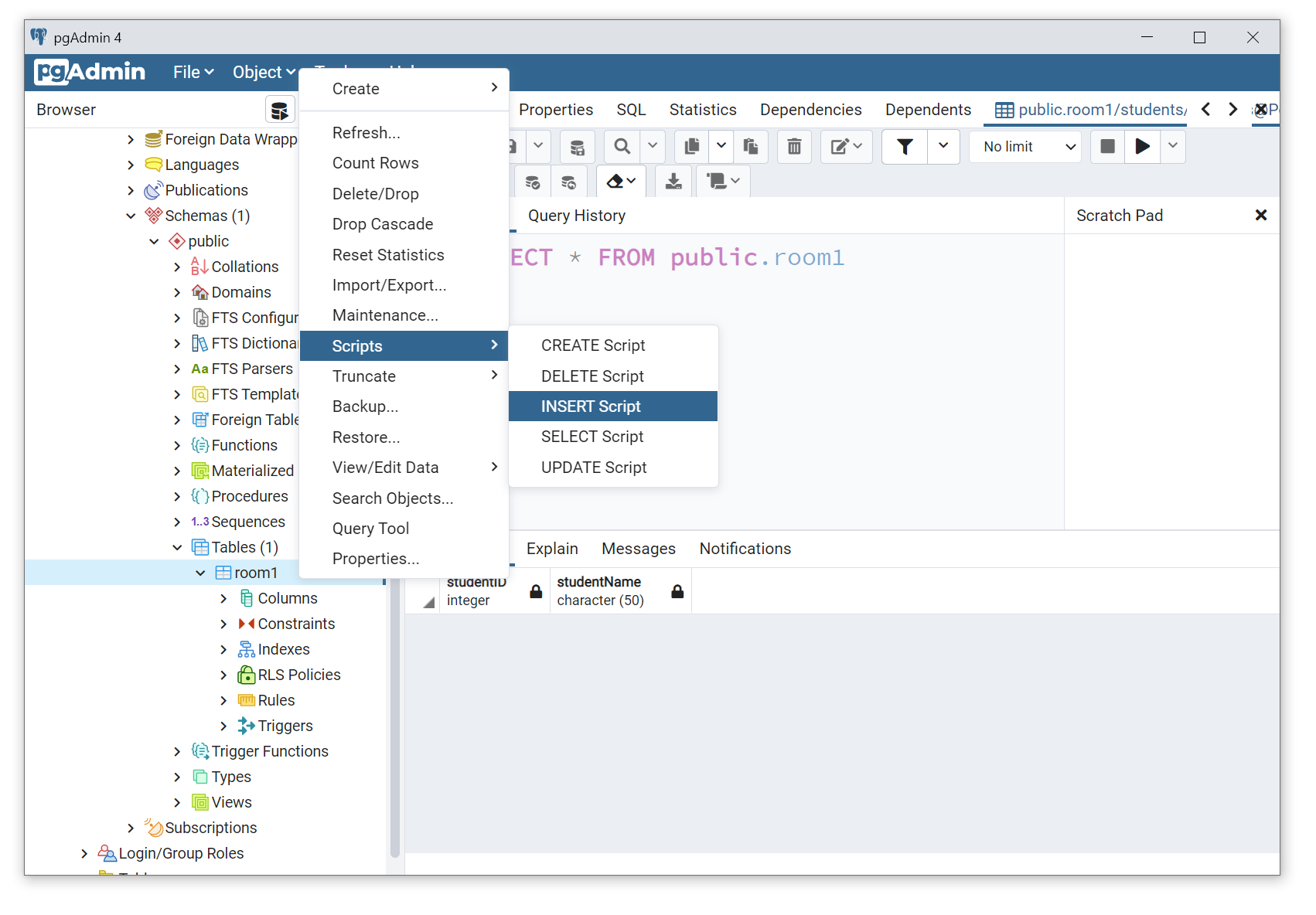 아래는 room1 테이블에 두 개의 칼럼을 만드는 예제입니다.