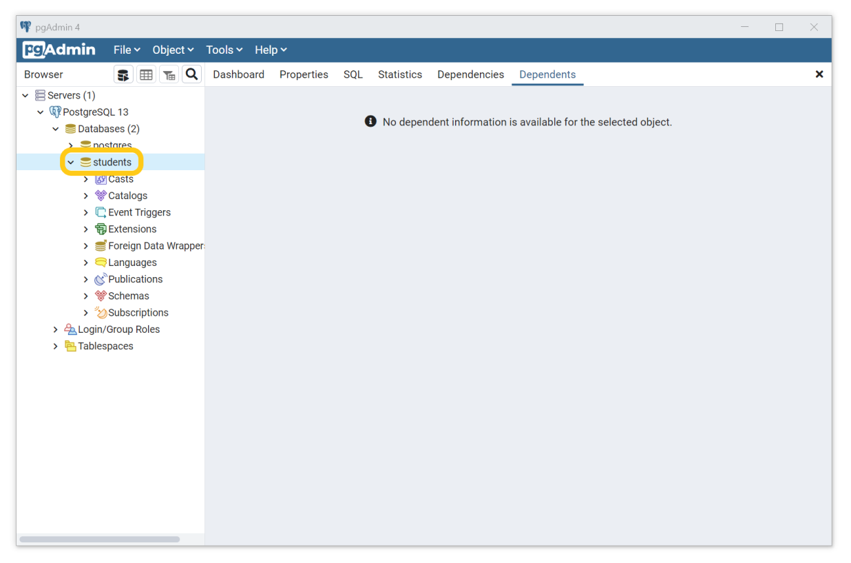 만약에 데이터베이스가 나타나지 않는다면 PostgreSQL 13 오른쪽 클릭 > Refresh를 해보세요!