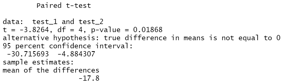 test_1 <- c(35, 50, 90, 78, 23) test_2 <- c(67, 72, 94, 91, 41) t.test(test_1, test_2, paired = TRUE)