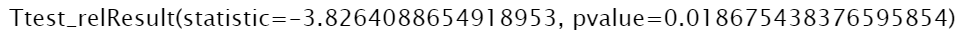 a = [35, 50, 90, 78, 23] b = [67, 72, 94, 91, 41] stats.ttest_rel(a, b)