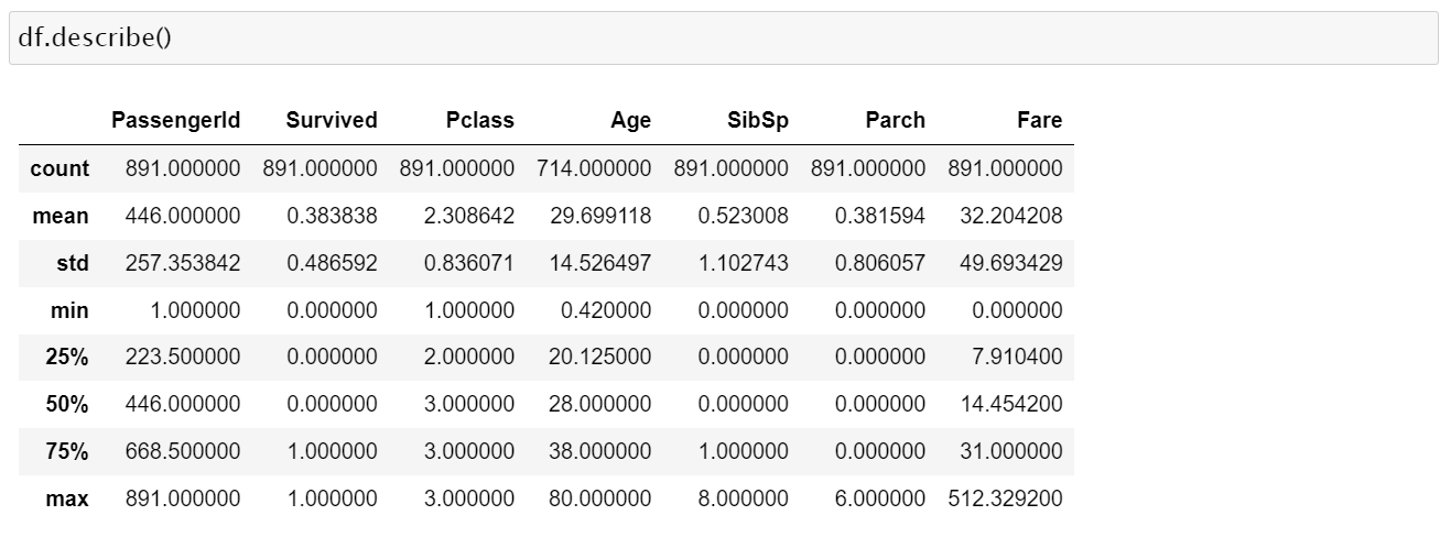 각 열마다 결측 값을 제외한 나머지 데이터의 기본 통계량을 출력합니다.