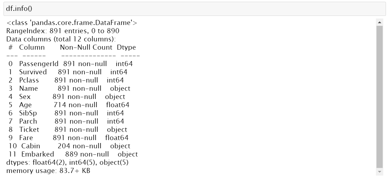 각 열의 데이터 타입 (int64, float64 등등), 결측 값을 제외한 데이터 값 개수와 메모리 사용량 등 다양한 정보를 확인할 수 있습니다.