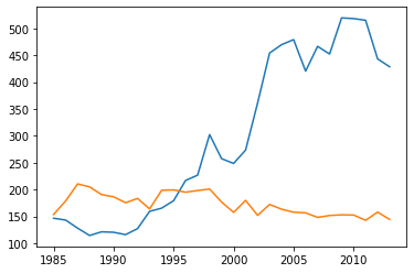 아래는 같은 연도 year (1985~2013년) 간 한국 자살률과 뉴질랜드의 자살률을 비교한 선 그래프입니다.