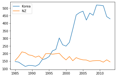 아래는 같은 연도 year (1985~2013년) 간 한국 자살률과 뉴질랜드의 자살률을 비교한 선 그래프입니다.