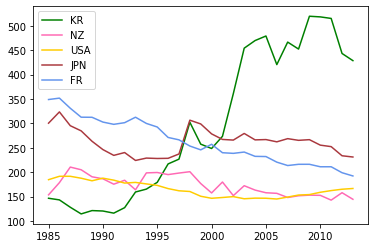plt.plot(year, kr_s, label = "KR", color="green") #이름으로 색 바꾸기