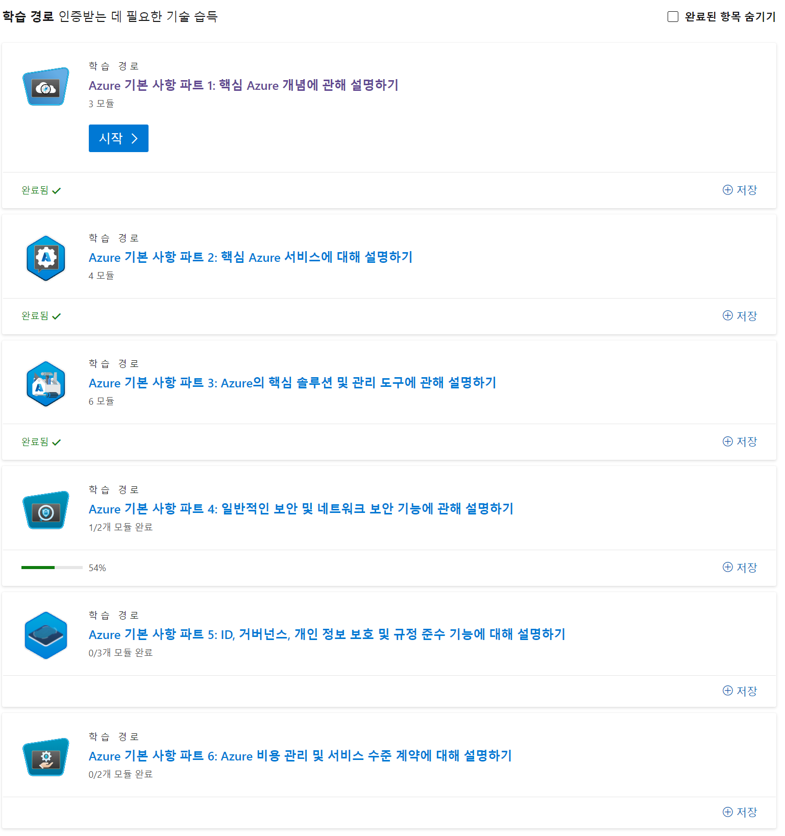 먼저 마이크로소프트에서 제공하는 학습 경로를 1회독 했습니다. 마이크로소프트에서 이 학습 경로를 완독 하는데 예상하는 시간은 대략 10시간입니다. 시험 과목마다 코스를 제공해 총 6개의 코스가 있습니다.