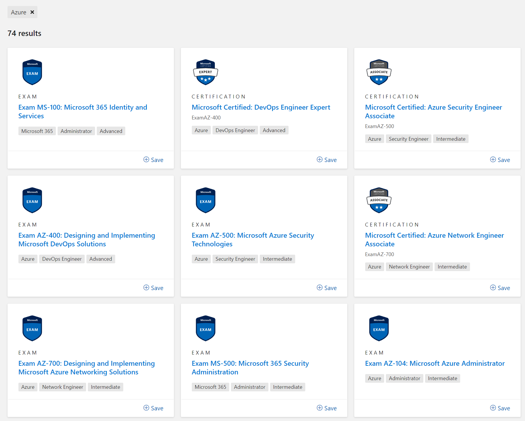 마이크로소프트에서 자격증은 초급 Beginner > 중급 Intermediate > 고급 Advanced으로 나뉘며 애저 Azure 관련 시험 및 인증만 70여 개가 존재합니다.