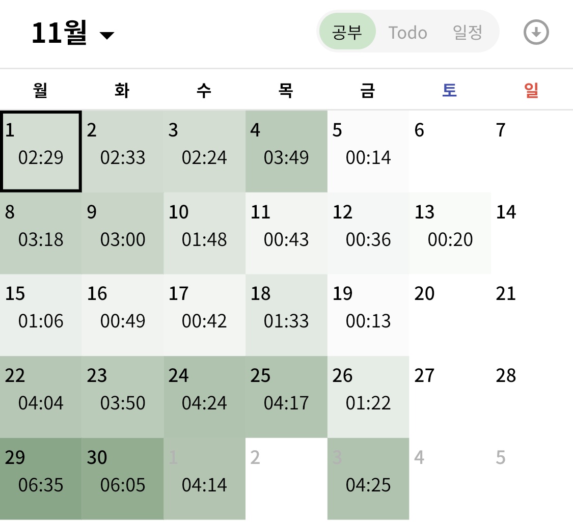 사실 애매하게 공부한 날도 (13, 14분 뭐지..?) 많았다.