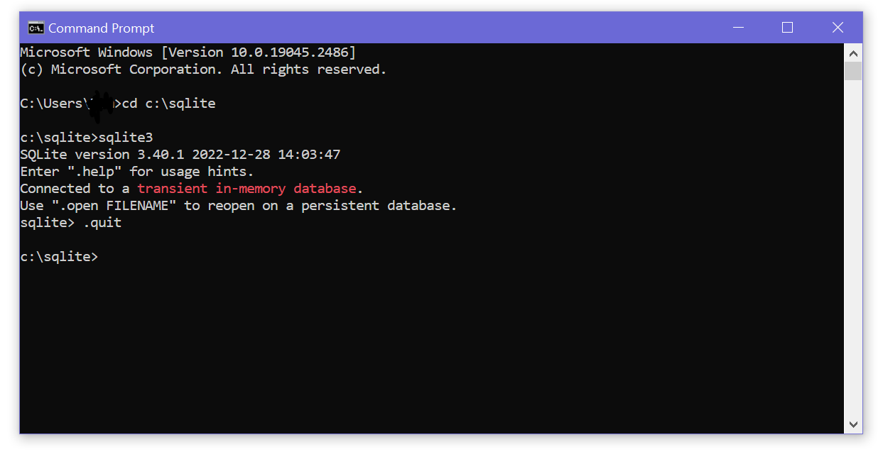 2. 위에 sqlit3.exe 파일을 넣어둔 디렉터리로 이동한다. sqlite3을 입력했을 때 아래와 같이 나오면 설치된 것을 확인할 수 있다.