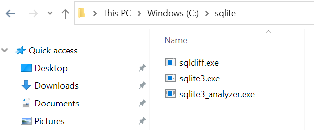 3. 원하는 위치에 폴더를 생성한 후 (예제 C:\>sqlite) 압축파일 압축을 푼다. 세 가지 파일 (sqlite3.def, sqlite3.dl, sqlit3.exe)이 있습니다.