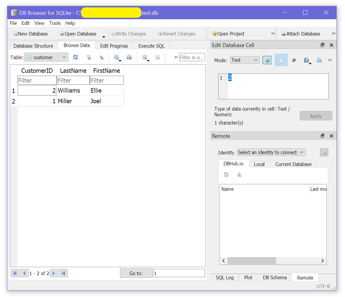 + DB Browser for SQLite로 test.db를 열어본모습입니다.