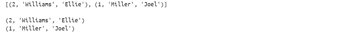 cursor.execute("INSERT INTO customer VALUES(1, 'Miller', 'Joel')")