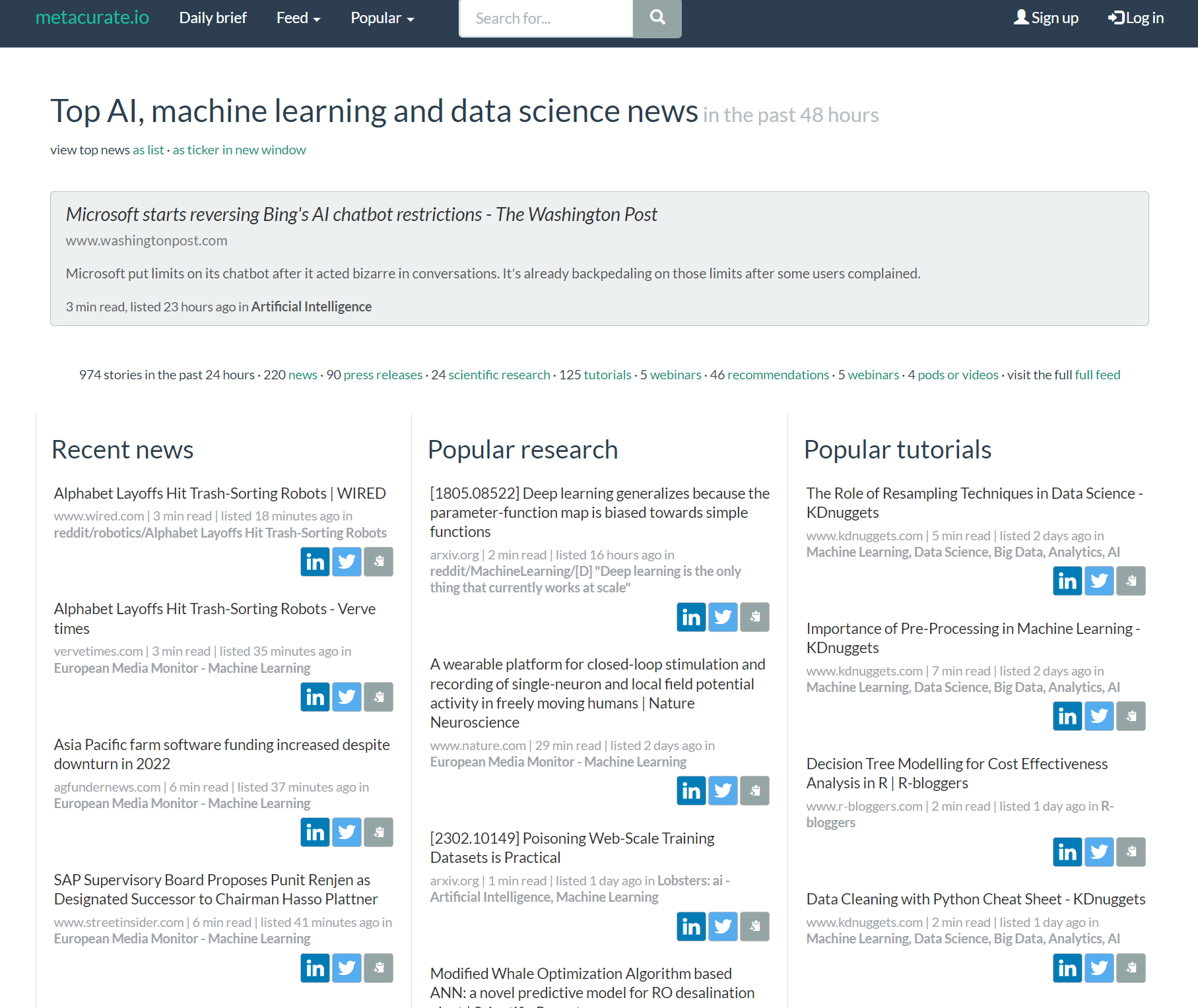 2.metacurate.io- AI/머신러닝/NLP/CV/데이터 과학 관련 논문/블로그 글 모음집. 뉴스레터, RSS 피드, 트위터에 해시태그 데이터를 사용해 제일 인기 있는 글들을 모아주는 사이트이다.