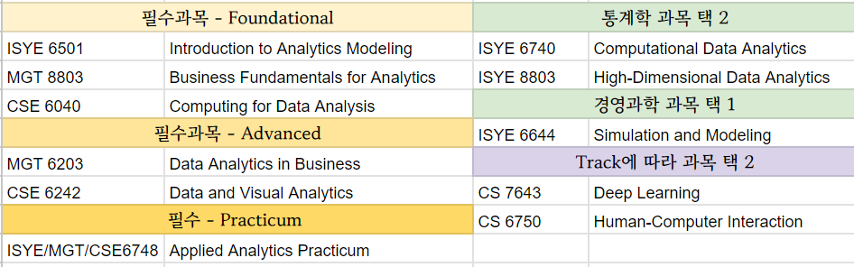 전체적인 커리큘럼 형식은 필수과목 5개 + 필수인 Practicum + 통계학 과목 2 + 경영과학 과목 1 + 개인 트랙에 따라 선택 2이다. 아래는 내가 들은 과목을 테이블 형식으로 만들어 보았다.