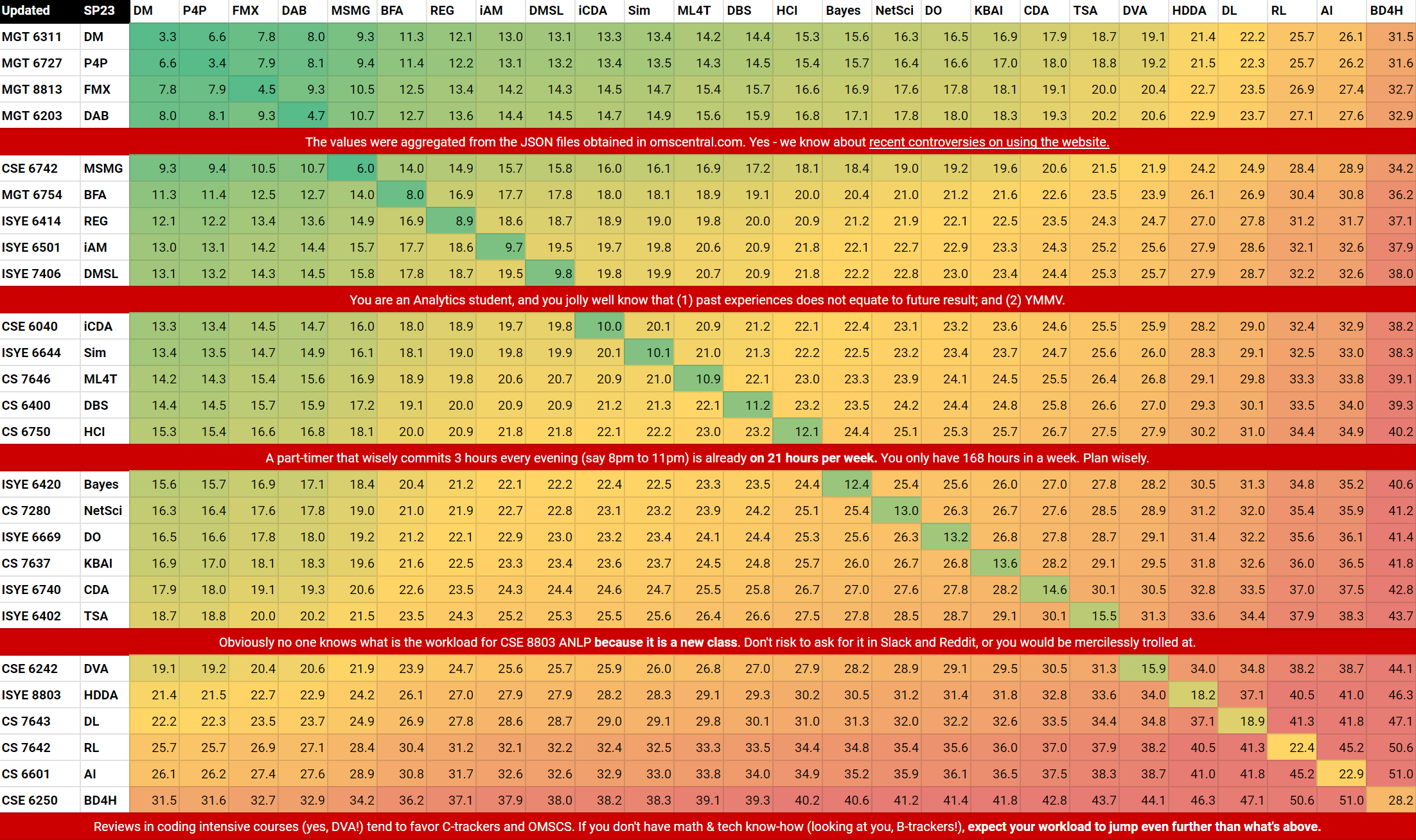 과목마다 투자해야 하는 시간이 다 다른 편이며 학생들의 리뷰를 모아 누가 아래와 같은 멋진 테이블을 만들어 놓았다.