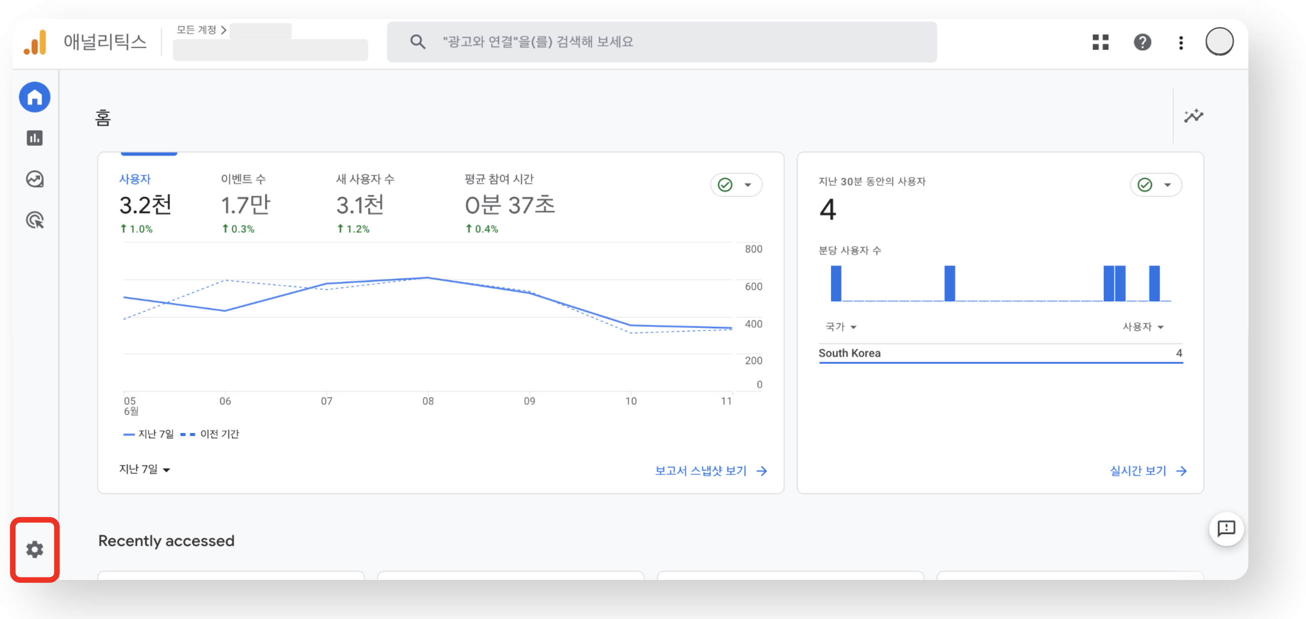 - 구글 애널리틱스에서 방금 만든 GA4 속성으로 이동한 다음, 왼쪽 하단의 '관리' 아이콘(톱니바퀴 모양)을 클릭합니다.