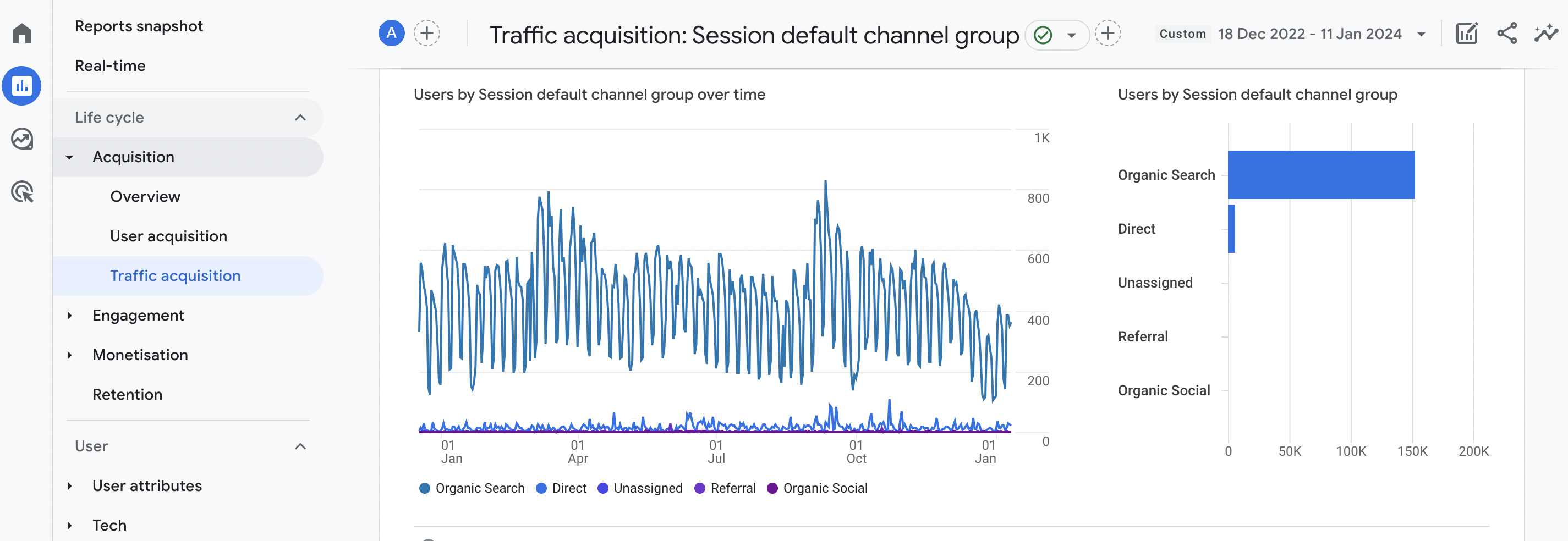 아래 구글 애널리틱스 데이터만 봐도 이 블로그의 대부분의 방문자가 자연검색을 통해 들어온다.