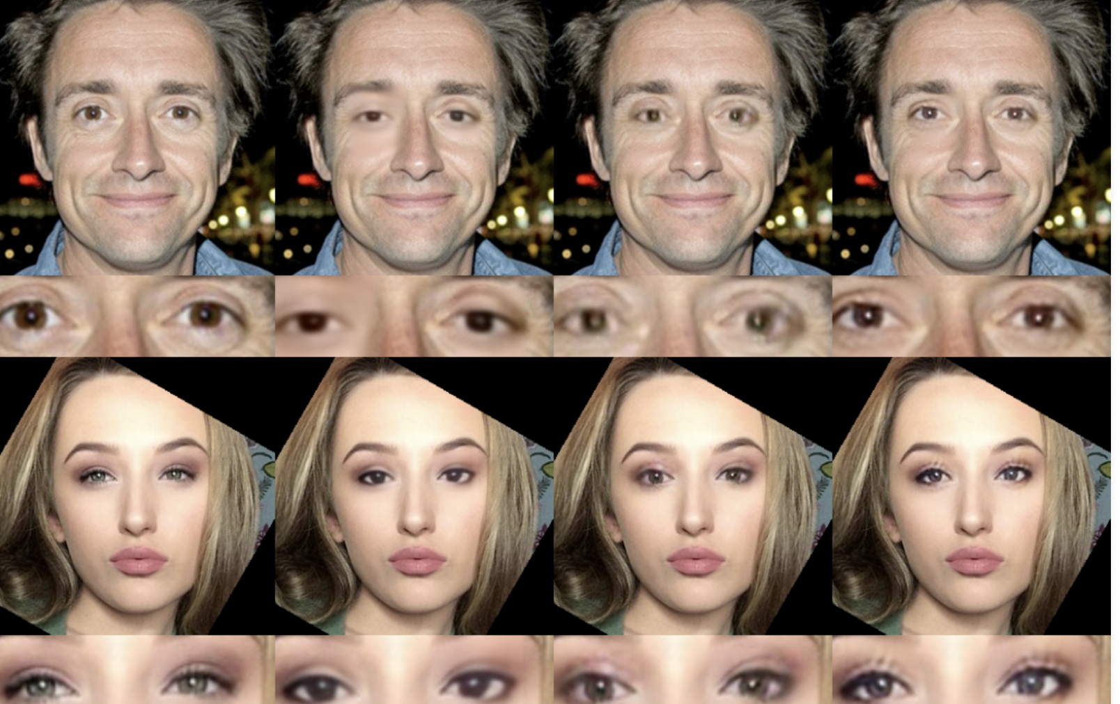 예를 들어, 페이스북 팀이 개발한 ExGAN은 in-painting GAN의 일종입니다. 아래 이미지에서 첫 번째 열은 원본 이미지, 두 번째 열은 기존 in-painting GAN을 사용해 눈 부위를 생성한 결과이며, 세 번째와 네 번째 열은 페이스북의 ExGAN이 생성한 눈 이미지입니다.