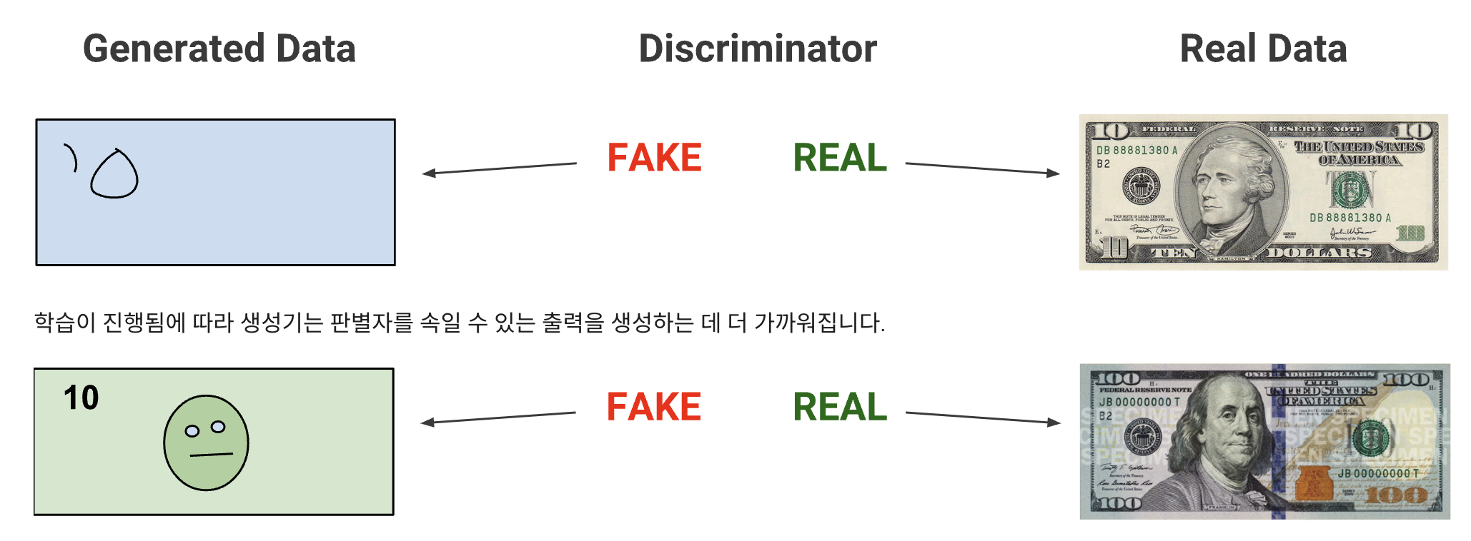 이 관계는 흔히 실제 지폐와 최대한 비슷한 지폐를 생성하는 위조지폐범 🦹🏻 (generator)과 진짜와 위조지폐를 잘 판별해야 하는 경찰 👮🏻(discriminator)로 비유됩니다.